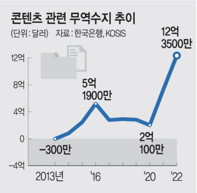 지난해 게임, 음악, 방송 등 ‘K-콘텐츠’의 무역 흑자가 역대 최고치를 기록한 것으로 나타났다. 수출액의 경우 2005년 대비 10배로 성장해 주요 수출 품목인 가전이나 전기차를 뛰어넘는 수준으로 파악됐다. 반도체 한파로 14개월 연속 전체 무역 적자가 이어지는 가운데, 수지 개선에 한 축을 맡아온 K-콘텐츠를 ‘제2의 반도체’로 육성할 필요성이 제기됐다.