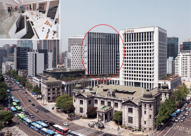한국은행이 27일 지상 16층, 지하 4층 규모의 신축 통합별관(빨간 원 안) 내·외관을 공개했다. 문화재로 지정된 한국은행 화폐박물관을 훼손하지 않는 방식으로 설계된 통합별관은 6년 만에 완공됐으며, 통합별관 로비(왼쪽 위 작은 사진)에는 한국은행의 제1 목표인 ‘물가안정’이 적힌 현판이 걸렸다.