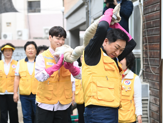 김기현 국민의힘 대표가 12일 오전 서울 성동구 이든아동복지종합타운을 방문, '국민의힘과 함께하는 세탁봉사' 활동을 하고 있다.