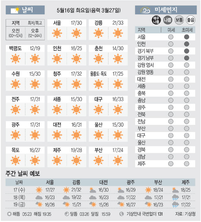 [날씨이야기] 5월16일 화요일(음력 3월27일)
