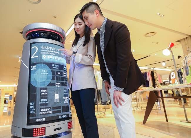 현대백화점은 다음 달 4일까지 서울 강남구 현대백화점 무역센터점 6층에서 인공지능(AI) 기반 안내 로봇 ‘GPT-플래티’ 체험 행사를 진행한다고 15일 밝혔다. 지난 14일 고객들이 로봇을 체험하고 있다.