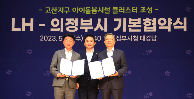 LH는 토지주택연구원(LHRI)의 연구 결과를 바탕으로, 아이돌봄시설 클러스터에 설치될 어린이집·다함께돌봄센터·시간제보육센터·실내놀이터·어린이도서관·식당·키즈공방 등을 제안했다. 이와 관련, LH는 지난 17일 의정부시 대강당에서 의정부 고산지구 주민들을 만나 지역 돌봄시설 관련 불편한 점, 건의사항 등을 듣고 의정부시와 ‘의정부 고산지구 아이돌봄시설 클러스터 기본협약(사진)’을 체결했다. 협약식에는 원희룡(사진 가운데) 국토교통부 장관, 이한준(오른쪽) LH 사장과 김동근(왼쪽) 의정부시장이 참석했다.
