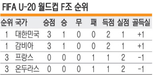 한국은 1승(승점 3)으로 온두라스를 2-1로 이긴 감비아(1승·승점 3)와 함께 공동 1위에 이름을 올렸다. 24개국이 경쟁하는 U-20 월드컵은 4개국씩 6개 조로 나뉘어 조별리그를 진행, 각 조 1∼2위가 16강에 진출한다. 그리고 6개 조 3위 가운데 상위 성적 4개국이 추가로 합류한다. 한국은 26일 오전 6시 온두라스와 조별리그 2차전을 치른다.