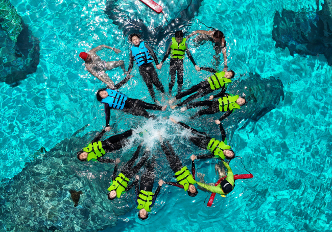 22일 경기 시흥시 인공서핑시설 ‘웨이브파크’에서 초등학생들이 인공 파도 속에서 생존수영을 배우고 있다.