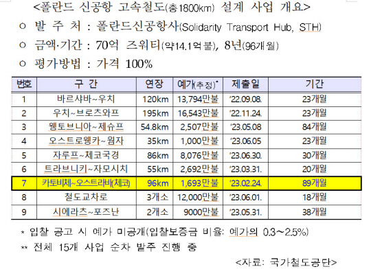 국가철도공단은 폴란드 신공항사(Solidarity Transport Hub·STH)에서 올해 2월 발주한 ‘카토비체~오스트라바 간 고속철도 설계용역’ 입찰에서 430억 원을 제안한 공단 컨소시엄이 선정되어 정식 계약을 앞두고 있다고 24일 밝혔다. 폴란드 신공항 건설 사업은 현재 있는 바르샤바 쇼팽공항을 대체하는 중동부 유럽 최대 허브공항을 만드는 프로젝트다.