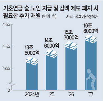 이와 함께 현행법은 부부가 모두 기초연금을 받는 경우 각각 20%를 감액하도록 규정하고 있는데, 김태년 민주당 의원의 개정안(지난해 6월 발의)은 이 부부 감액 조항을 삭제했다. 국회예산정책처에 따르면 야당 의원들이 추진하는 법안대로 기초연금 대상이 모든 노인으로 확대되고, 국민연금·부부 감액 조항까지 폐지되면 △2024년 13조6000억 원 △2025년 14조6000억 원 △2026년 15조7000억 원 △2027년 16조6000억 원의 추가 재원이 필요한 것으로 추산된다.