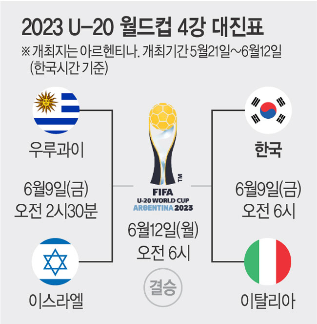 한국은 오는 9일 오전 6시 라플라타에서 유럽의 강호 이탈리아와 결승행을 다툰다. 이탈리아는 우승후보인 브라질과 잉글랜드를 모두 꺾고 3회 연속 4강행을 달성했다. 이번 대회 득점 1위(6골) 체사레 카사데이(레딩)가 경계대상 1호다. 한국은 그러나 이탈리아와 역대 전적에서 2승으로 앞선다. 한국은 이번 대회를 앞두고 큰 기대를 하지 않았다. 2019년 폴란드 대회 당시 골든볼(MVP)을 수상한 이강인(마요르카) 같은 스타 플레이어가 없기 때문이다. 전체 21명 가운데 19명이 프로선수지만 소속팀에서 주전급으로 분류되는 건 배준호(대전 하나시티즌)밖에 없다. 이번 대표팀은 이전 세대에 비해 전력이 약한 ‘골짜기 세대’로 불렸다.
