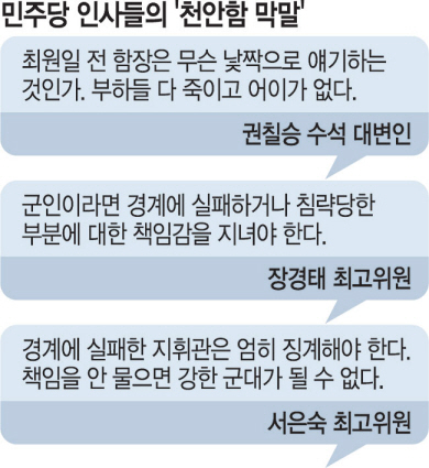 민 씨는 이날 문화일보와의 통화에서 “민주당 장경태·서은숙 최고위원의 발언을 보고 화가 치밀어 올랐다”며 “민주당은 가진 것이라곤 세 치 혀밖에 없는 정치인들이 보여준 저급한 품격부터 일벌백계해야 한다”고 목소리를 높였다. 이어 “천안함 자폭에 대한 음모론을 주장하거나 동조하다가 이제는 참전 장병과 유족들을 갈라치기까지 하는가”라며 “최 전 함장의 지휘 능력은 적성국가인 러시아 조사단으로부터도 인정받았다. 하늘로 떠난 형제들을 모욕하는 치졸한 행동을 중단해달라”고 절절히 호소했다. 앞서 장 최고위원은 전날 라디오에서 “군인은 경계에 실패하거나 침략당한 부분에 대한 책임감도 있어야 한다”고 주장했고, 서은숙 최고위원 역시 당 최고위원회의에서 “경계에 실패한 지휘관에겐 엄한 징계가 있어야 한다”고 말했다. 민 씨는 이들의 발언에 대해 “‘함장이 너희들을 죽였는데 왜 너희들은 분노하지 않느냐’라고 말하는 것과 마찬가지”라고 꼬집었다. 그러면서 “우리 유족들은 전혀 분노하지 않는다. 최 전 함장을 존경한다”고 덧붙였다.