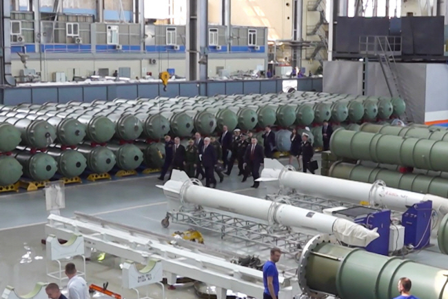 7일 세르게이 쇼이구(앞줄 가운데) 러시아 국방장관이 국영 미사일 제조기업 알마즈-안테이 시설을 관계자들과 함께 시찰하고 있다.
