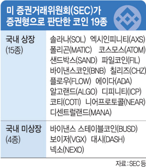 미국 증권거래위원회(SEC)가 세계 최대 가상화폐 거래소인 바이낸스와 코인베이스를 기소하면서 20종에 가까운 코인을 대거 증권성으로 판단했다. 여기에는 국내 가상화폐 거래소에서 원화로 사고파는 원화마켓에 상장된 코인도 15종이나 포함된 것으로 파악돼 국내에도 파장이 예상된다. 미등록 증권성 코인으로 2020년 12월 기소되면서 시세 폭락을 겪은 ‘리플 사태’가 재연되는 것 아니냐는 우려가 나온다.