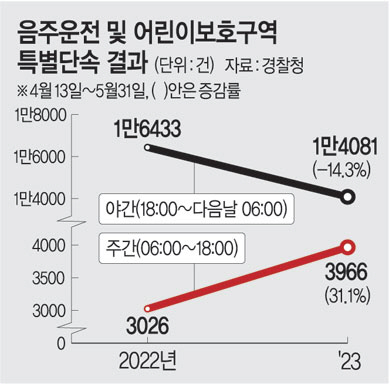 9일 경찰에 따르면 경찰청이 지난 4월 13일부터 5월 31일까지 주간(오전 6시부터 오후 6시)과 야간(오후 6시부터 다음 날 오전 6시)으로 나눠 음주운전 특별단속을 벌인 결과, 야간 음주단속은 전년 같은 기간에 비해 14.3% 감소한 반면에 주간 음주단속은 31.1% 증가했다. 김면기 경찰대 법학과 교수는 “그동안 암암리에 있었던 주간 음주운전이 집중 단속으로 수면 위로 나타난 것”이라며 “이제는 운전자도 음주운전 단속은 시간과 장소를 가리지 않고 엄정하게 진행된다는 경각심을 가져야 한다”고 말했다. 이윤호 동국대 경찰행정학과 명예교수도 “주간 단속보다는 야간 단속이 잦으니 운전자들이 주간엔 방심하기 쉽다”며 “요새는 음주 측정 기계의 성능이 굉장히 올라서 전날에 마시거나 낮에 조금 반주한 것도 다 걸리게 돼 있다”고 설명했다.
