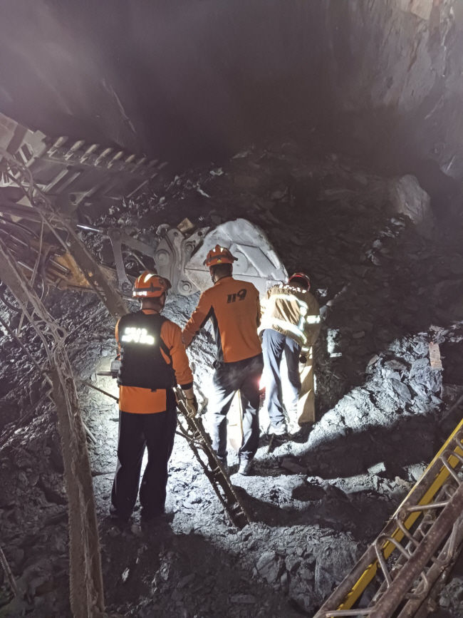 8일 오후 10시 22분쯤 충북 충주시 직동 발티∼재오개 터널 공사 현장에서 무너진 흙더미에 깔려 고립된 작업자를 소방대원들이 구조하고 있다. 작업자는 2시간 30분 만에 무사히 구조됐다.