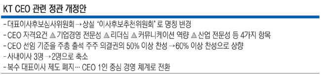 KT에 따르면 새 정관에서 CEO 자격 요건은 기업경영 전문성, 리더십, 커뮤니케이션 역량, 산업 전문성 등 네 가지 항목으로 바뀐다. 기존에 있던 ‘정보통신 분야의 전문적 지식·경험’ 문구는 빠졌다. KT는 “그룹사가 ICT만 있는 것이 아니기에, ICT에 국한하기보다 산업 전반에 대한 전문성으로 영역을 확대했다”고 설명했다. 반면 관련 업계에서는 ‘ICT 분야로 사실상 제한했던 CEO 자격을 개방했지만, 거꾸로 보면 외부의 폭넓은 낙하산 인사 가능성을 열어둔 것과도 차이가 없다’는 해석이 나오고 있다.