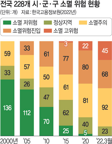 경북도는 전국 광역 지자체 중 인구소멸 위험지역이 가장 많은 곳이다. 도내 23개 시·군 중 18곳이 인구소멸 위험지역이다. 한때 내륙 최대 수출기지로 불리던 구미시 또한 청년 인구 감소로 지역산업이 쇠퇴하면서 인구 40만의 마지노선도 무너질 위기다. 도에 따르면 월평균 100만 원을 소비하는 학생 3000명이 줄어들 경우 해당 지역에는 최소 월 30억 원의 직접적인 소비 감소가 일어난다. 여기에 학령인구 감소에 따른 정원 미달로 지방의 중소대학이 줄줄이 통폐합되거나 폐교하면서 지역소멸에 대한 위기감이 빠르게 전이되고 있다.
