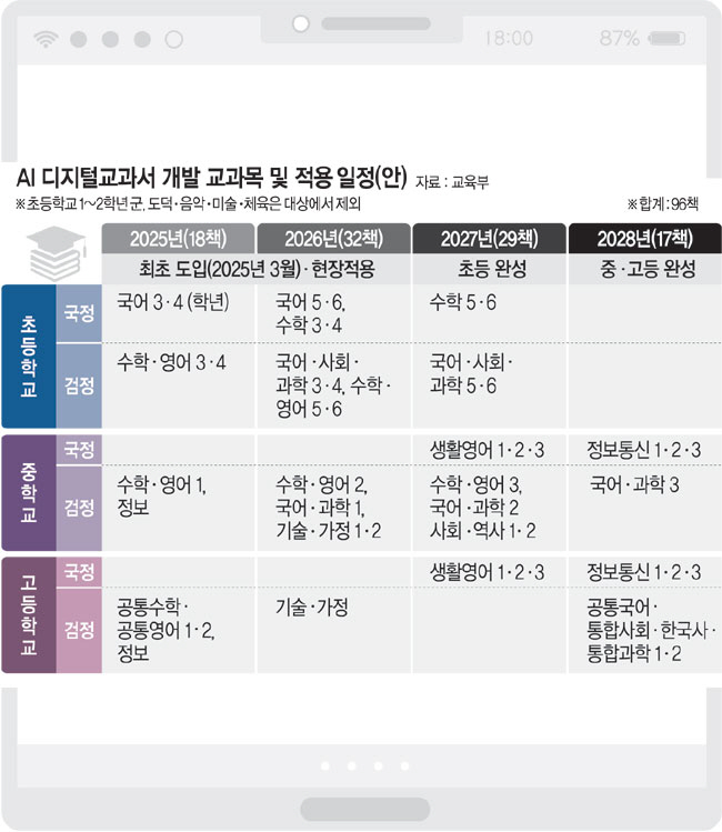 AI 디지털교과서가 2025년부터 모든 학생, 전 과목에 일괄적으로 도입되는 것은 아니다. ‘2022 개정교육과정’ 적용에 맞춰 2025년엔 우선 초등학교 3∼4학년, 중1, 고1 학생부터 AI 디지털교과서를 사용하게 된다. 2026년에는 초등학교 5∼6학년과 중2, 2027년에는 중3 등으로 사용 대상이 확대된다. 학년별로 보면 초등학교 1∼2학년만 AI 디지털교과서를 쓰지 않는데, 이들 연령대는 디지털 기기를 접하기에 이르다는 교육 현장·전문가 의견을 반영했다.