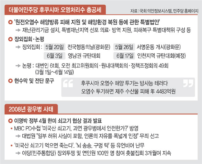 더불어민주당이 후쿠시마(福島) 오염처리수 방류에 따른 피해를 기정사실로 규정해 국가 재정으로 어민을 지원하는 내용의 특별법을 발의한 것은 지난 2008년 ‘광우병 사태’ 당시처럼 먹거리에 대한 국민 불안이 커지는 틈을 타 장외 투쟁과 입법 활동을 병행하면서 내년 총선에서 유리한 고지를 선점하려는 의도로 풀이된다. 하지만 전문가들은 과학적 근거가 빈약한 ‘괴담 정치’로 피해를 조장한 뒤 ‘생색내기용 지원’에 나서는 것은 “병 주고 약 주는 방식의 입법에 불과하다”는 비판을 제기하고 있다.
