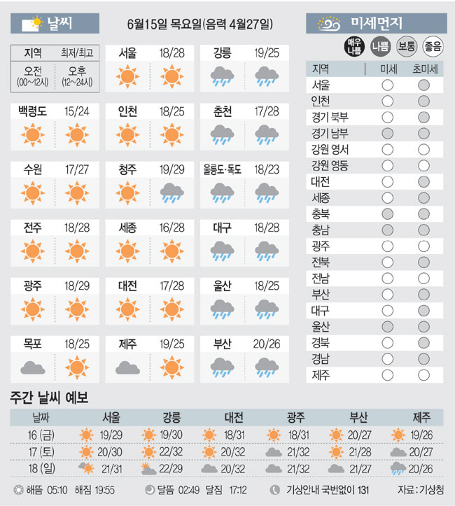 [날씨이야기] 6월15일 목요일(음력 4월27일)