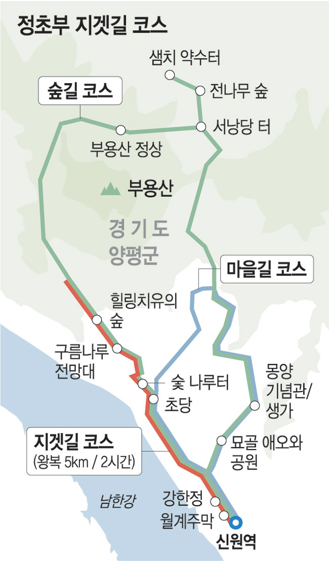 정초부 지겟길은 코스가 모두 3개다. 신원역에서 출발해 남한강 자전거 도로를 따라가다가 힐링치유의 숲으로 이어지는 왕복 5㎞의 ‘지겟길 코스’와 신원역에서 몽양 여운형 기념관과 정초부가 살았던 초당을 지나 강한정으로 가는 2.8㎞의 ‘마을길 코스’, 그리고 신원역에서 부용산 정상을 거쳐 초당을 연결하는 4.3㎞의 숲길 코스가 있다. 가장 짧은 마을길 코스가 1시간 30분쯤, 지겟길 코스는 2시간 남짓, 숲길 코스는 3시간 정도 걸린다.