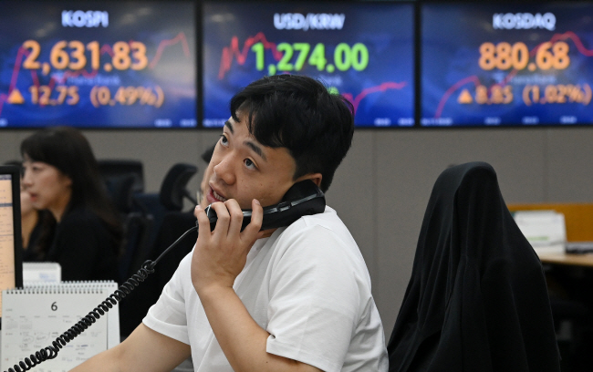 코스피가 전 거래일(2619.08)보다 10.16포인트(0.39%) 오른 2629.24에 장을 연 15일 오전 서울 중구 하나은행 본점 딜링룸에서 딜러들이 업무를 보고 있다. 이날 코스닥지수는 전 거래일(871.83)보다 5.79포인트(0.66%) 상승한 877.62에, 원·달러 환율은 전 거래일(1278.5원)보다 4.3원 내린 1274.2원에 개장했다.