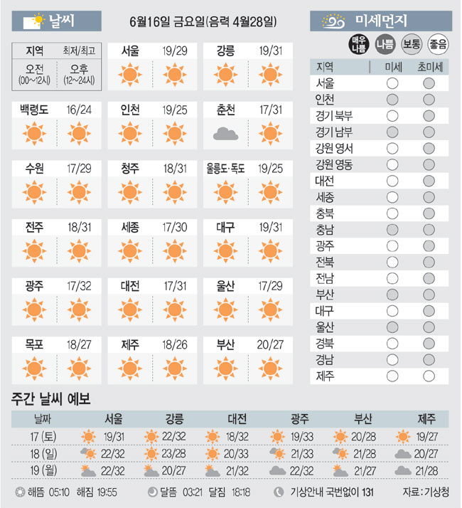 [날씨이야기] 6월16일 금요일(음력 4월28일)