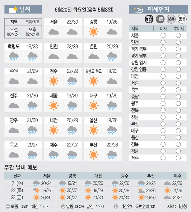 [날씨이야기] 6월20일 화요일(음력 5월3일)