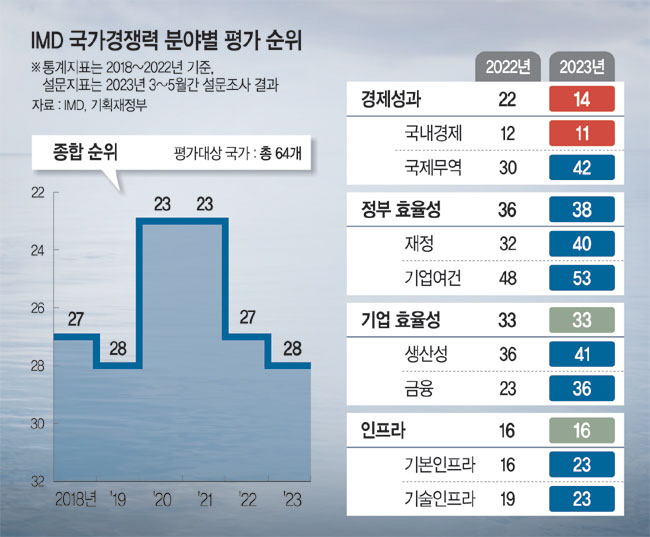 스위스 국제경영개발대학원(IMD)이 19일(현지시간) 공개한 ‘2023년 국가경쟁력 종합평가’에서 한국은 지난해(27위)보다 한 계단(28위)만 하락하면서 선방한 것처럼 보이지만 세부내용을 뜯어보면 상황은 심각하다. 악화한 재정과 기업여건 등 정부 효율성 분야와 함께 기업 관련 세부 부문에서 순위가 대폭 추락했기 때문이다.