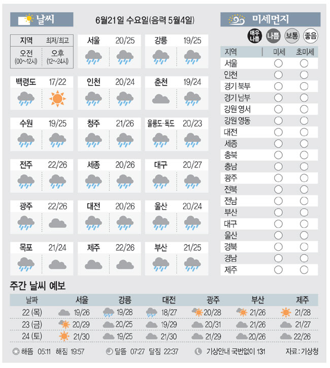 [날씨이야기]6월21일 수요일(음력 5월4일)
