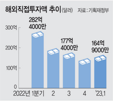 올 1분기 해외직접투자액은 164억9000만 달러로 전년 동기와 비교해 절반에 가까운 41.6% 감소한 것으로 나타났다. 미국을 중심으로 한 2차전지 투자가 있었지만 지난해 1분기 반도체 부문 대규모 투자가 기저효과로 작용하며 제조업 투자가 54.2% 감소한 영향이 컸다. 다만, 글로벌 고금리·우크라이나 전쟁 장기화로 인한 투자심리 위축 영향으로 4분기째 이어지던 분기별 투자 감소는 멈춤에 따라 규제 완화 등 해외 진출 기업의 국내 복귀 지원을 강화해야 한다는 지적이 나온다.