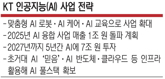 KT가 로봇·케어·교육 분야로 인공지능(AI) 사업을 확대한다. 이에 맞춰 2027년까지 AI 사업에 약 7조 원을 투자해 ‘AI 서비스 프로바이더(Provider)’로 올라서겠다고 발표했다.