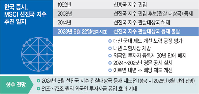 MSCI 지수는 선진국, 신흥국을 비롯해 프런티어 시장, 단일 시장 등으로 구성되는데 이 분류가 전 세계 주식시장의 기준이 되고 있다. 한국은 1992년 신흥국 지수에 편입된 이후 꾸준히 선진국 승격을 위해 노력해 왔지만 번번이 좌절했다. 2014년에는 선진국 지수 후보격인 관찰대상국에서도 제외됐다. 이는 코리아 디스카운트의 원인으로도 지적돼왔다. 그만큼 한국 증시가 선진국 지수로 승격되는 것은 증시엔 큰 호재다. 선진국 지수를 따르는 투자 자금이 막대한 규모이기 때문이다. 승격 시 한국 증시로의 자금 유입 효과가 한국경제연구원은 61조 원, 골드만삭스는 73조 원에 달할 것으로 추산하고 있다.