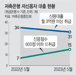 23일 저축은행중앙회에 따르면 지난 5월 말 현재 개인 신용대출을 월간 3억 원 이상 취급한 저축은행 31곳 가운데 15곳은 신용점수가 600점 이하인 사람에게 돈을 빌려주지 않았다. 신용점수 600점 이하 대출 미취급 저축은행은 1년 전(7곳)과 비교해 2배 가까이로 늘었고, 전월에 비해서도 4곳 증가했다. 개인 신용대출 3억 원 이상 취급 저축은행 수도 1년 전(34곳)보다 줄었다. 법정 최고금리가 20%로 낮아진 가운데 지난해부터 이어진 7연속 기준금리 인상으로 저축은행의 조달 비용이 급격히 오르면서 저신용자의 대출 문턱이 높아진 것으로 풀이된다.