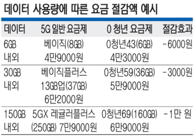 가장 큰 인기 요인은 뚜렷한 요금 절감 효과가 꼽힌다. 5G 일반요금제 가입자가 0 청년 요금제로 변경할 경우 데이터 이용 구간별로 최소 3000원에서 최대 1만 원에 달하는 요금 절감 효과를 거둘 수 있다. 예컨대 월 150GB 이상 데이터를 쓰는 청년은 기존에 SK텔레콤 5GX 레귤러플러스(월 7만9000원, 250GB 제공)에 가입해야 했으나 이제는 0 청년 69(월 6만9000원, 160GB 제공)로 변경해 요금 1만 원을 낮출 수 있다.