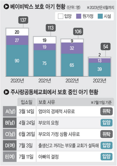 지난 2013년부터 매년 100~200명의 아기들이 이곳 베이비박스에 맡겨졌다. 올해(1~6월 기준) 총 54명의 아기가 베이비박스에 왔고, 이 중 24%인 13명은 원가정으로 돌아갔다. 2명은 입양이 됐고, 나머지 39명은 아동복지시설로 갔다. 주사랑공동체 관계자는 “베이비박스에 온 아기 10명 중 3명 정도는 원가정 혹은 입양가정에서 보호를 받게 된다”면서 “베이비박스가 ‘유기 장소’가 아닌 이유이다. 아기는 이곳에 버려진 것이 아니라, 이곳에서 지켜진 것”이라고 강조했다.