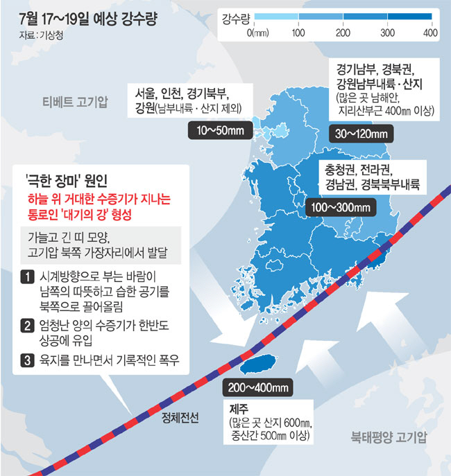 충남 청양 570.5㎜·전북 익산 500㎜·경북 문경 487㎜ 등 동서를 가리지 않고 지난 13일부터 주말 사이 기록적인 폭우가 한반도를 가로질렀다. 과거 폭우는 시간당 강수량이 높았지만, 지난 주말 폭우 때는 시간당 강수량이 기록적인 수준은 아니었지만, 지속 시간이 길어 많은 비를 뿌렸다.