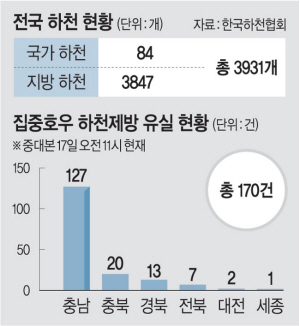 이날 중앙재난안전대책본부에 따르면 이날 오전 11시 현재 기준 지역 하천 제방 유실은 충남 127건, 충북 20건, 경북 13건, 전북 7건, 대전 2건, 세종 1건 등 총 170건인 것으로 집계됐다. 홍수 피해가 큰 충청과 남부지방을 중심으로 강한 장맛비가 이어질 것이라는 예고하에 충청과 전북, 경북 등 지역에는 여전히 홍수특보가 발효 중이다. 이런 상황에서 중대본은 관계 기관에 하천 범람 등에 대비해 사전 통제와 주민 대피를 적극 실시할 것을 지시하고 있지만 중대본은 붕괴한 제방 하천이 누가 관리하는 하천인지까지는 파악하고 있지 못한 실정이다. 지난해 1월 물관리 일원화에 따라 하천 업무가 국토교통부에서 환경부로 이관되고 환경부가 5대 강 본류와 일부 국가하천을 제외한 나머지 국가하천 유지·보수를 지자체에 위임한 것도 하천 관리 주체를 모호하게 하고 있다. 충북 청주시 오송읍 궁평제2지하차도 침수사고와 관련해 행정중심복합도시건설청(행복청)이 미호천교 공사를 담당하고 있어 청주시에서는 2018년 2월 이후 관할 업무가 아니라는 이유로 공사 일대를 관리 대상에서 제외해 왔다. 청주시 관계자는 “미호강 유지 관리 업무를 위임받아 하고 있지만 사고 구간 일대는 미호천교 공사 중으로 하천 점용허가를 받은 행복청 관할이어서 관리를 하고 있지 않다. 우리는 제방 축조의 권한도 없다”고 책임을 행복청에 돌렸다.