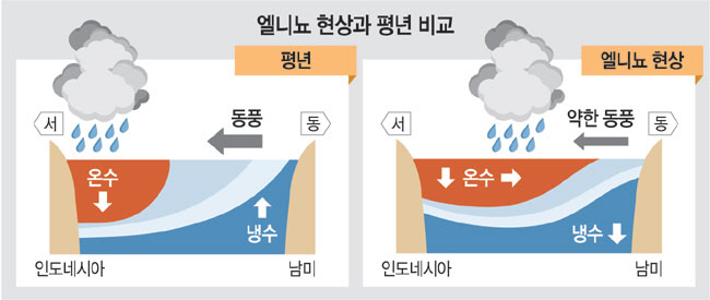 하지만 오늘날 엘니뇨는 동태평양(남아메리카 페루와 에콰도르 서쪽 바다) 해수면 온도가 평년보다 0.5도 이상 높은 채로 5개월 이상 지속하는 현상을 의미한다. 1.5도 이상 차이가 나면 ‘강한 엘니뇨’, 2도 이상은 ‘슈퍼 엘니뇨’라고 한다. 이는 무역풍을 약화시키고 동태평양 적도 지역의 수온을 높여 이상기후를 몰고 온다. 남반구 지역에서는 고온 현상으로 인한 열병과 말라리아 등 전염병이, 북반구 지역에서는 한파와 대설이 자주 발생하고 적도 지역에는 비가 많이 오는 게 특징이다.