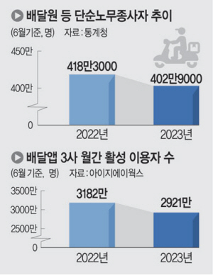 18일 통계청 국가통계포털 자료를 보면 지난달 배달 라이더 등을 포함한 단순노무종사자는 전년 동기 대비 15만4000명(3.7%) 감소한 402만9000명으로 집계됐다. 지난 4월부터 전년 대비 3개월 연속 줄었다. 코로나19 사태를 계기로 크게 늘었던 라이더들이 배달시장이 위축되자 발 빠르게 대거 이탈한 영향으로 풀이된다. 배달 앱 이용자 역시 급감하고 있다. 빅데이터 플랫폼 모바일인덱스에 따르면 지난달 배달 앱 3사(배달의민족·쿠팡이츠·요기요) 이용자 수는 1년 전보다 261만 명 줄어든 2921만 명으로 집계됐다. 라이더 부족으로 자영업자, 소비자들이 불편을 겪자 배달 앱들은 각종 프로모션을 통해 라이더 유인에 총력을 기울이고 있다. 배달의민족 라이더들을 맡고 있는 우아한청년들은 오는 31일까지 배달 시 주어지는 포인트를 채우면 최고 100만 원과 추가 보상을 지급한다. 쿠팡이츠서비스도 월·주·일 단위 배달 과제를 완수하면 추가 배달비 등을 제공하는 프로모션을 상시 진행하고 있다.