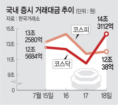 거래대금은 일일 매도액과 매수액을 합한 것으로 지수의 활기를 측정하는 지표가 된다. 코스피는 주요 기업들이 포함돼 있어 전체 시가총액 규모가 코스닥에 비해 훨씬 크고 거래대금도 더 많은 것이 일반적이다. 18일 기준 코스피의 시가총액은 2068조7937억 원으로 441조3678억 원인 코스닥의 4배 이상이다.
