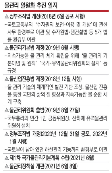 문 정부에서 추진된 물관리 일원화는 4대강 사업에 대한 환경운동단체들의 극단적인 혐오가 문 정부 출범과 함께 정책으로 이어진 것이라는 게 정부 내의 중론이다. 수질·환경 관리를 맡아온 환경부가 폭우·홍수 등 재난 상황에 대비한 물관리 정책을 맡은 것 자체가 무리라는 것이다. 조원철 연세대 토목환경공학과 명예교수는 “총괄적으로 하천 관리는 국토부에서 담당하는 게 바람직하다”며 “국내 3843개에 달하는 하천을 너무 쪼개놓다 보니 관할이 나뉘는 하천 접속부에서 관리 부실로 문제가 발생하는 상황이 벌어지고 있다”고 지적했다.