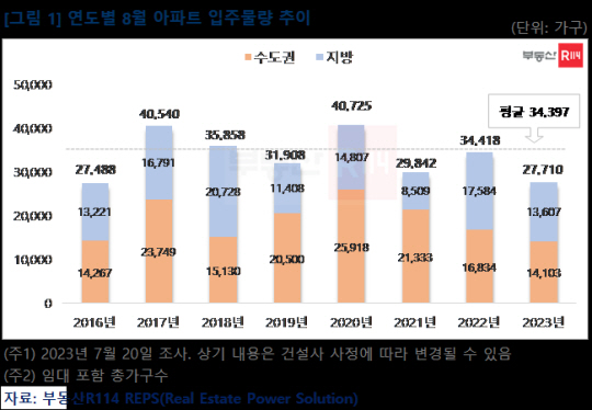 24일 부동산R114에 따르면, 8월 전국 아파트 입주 예정물량은 모두 2만7710가구(임대 포함)로 집계됐다. 8월 기준으로 2016년 2만7488가구 이후 가장 적은 물량이다. 또 2016∼2022년의 8월 평균 물량(3만4397가구)과 비교하면 약 20% 줄었다.