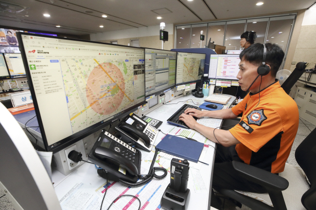 KT가 대전 지역 소방·응급구조 차량 150대에 초정밀 측위 솔루션을 제공한다고 밝힌 24일 대전 서구 둔산로 대전소방본부에서 소방관이 위치 정보를 확인하고 있다. 초정밀 측위는 이동통신을 이용해 오차 범위가 수십m인 GPS 정확도를 ㎝ 단위로 개선하는 서비스다.