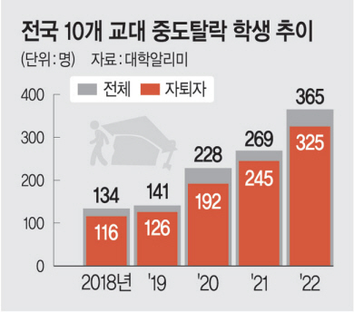 문화일보가 26일 대학정보공시 사이트 ‘대학알리미’를 분석한 결과 최근 5년(2018∼2022년)간 전국 10개 교대에서 자퇴·미등록·미복학 등의 이유로 중도탈락한 학생이 1037명에 달했다. 연도별로는 2018년 134명에서 2019년 141명, 2020년 228명, 2021년 269명, 2022년 365명으로 해마다 늘고 있다.