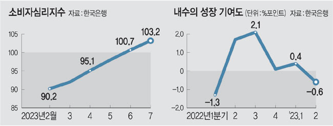 한은은 소비 심리가 개선되는 점 등을 고려해 민간 소비가 향후 완만한 회복세를 이어갈 것으로 내다보고 있지만 불확실성은 높은 상황이다. 연초에 코로나19 방역조치 전면 해제로 크게 늘었던 대면 활동 소비 증가 효과가 희석되면서 민간소비 성장률은 1분기 0.6%(직전분기대비)에서 2분기 -0.1%로 뒷걸음질을 쳤다. 가파르게 치솟은 외식비나 개인 서비스 물가 수준도 여전히 민간소비 회복의 발목을 잡고 있다. 민간소비와 정부소비, 기업투자 등이 일제히 줄면서 2분기 내수의 성장 기여도는 -0.6%포인트까지 떨어졌다.