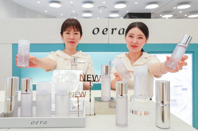 현대백화점그룹 계열 패션전문기업인 한섬이 운영하는 화장품 브랜드 ‘오에라(Oera)’가 7월 31일 ‘캘리브레이팅 컬렉션’ 신제품 2종(에센스·미셀라 워터)을 출시했다. 사진은 현대백화점 매장에서 직원이 신제품을 소개하고 있는 모습.