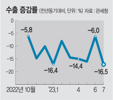 7월 수출이 503억 달러로 전년 동기 대비 16.5% 감소하면서 10개월 연속 마이너스를 기록했다. 특히 반도체 수출은 12개월째 마이너스 행진을 이어가고 있지만, 글로벌 에너지·원자재 가격 하락으로 수입이 더 많이 줄면서 무역수지는 흑자였다. 2개월째 흑자지만 수출 감소세가 여전히 이어지면서 반도체 및 중국 수출에 과도하게 의존하는 경제체질 개선에 시급히 나서야 한다는 목소리가 갈수록 커지고 있다.