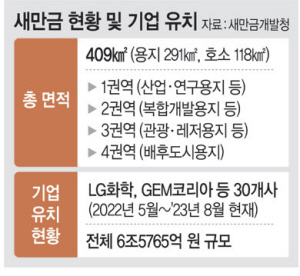 새만금 성과는 숫자로 나타나고 있다. 전북도 및 새만금개발청에 따르면, 2013년 새만금개발청이 설립된 이후 9년 동안 새만금 국가산단 투자 유치 규모가 1조5000억 원이었는데, 윤 정부 출범 이후 1년간 30개 기업에서 그 4배가 넘는 6조6000억 원에 이르는 투자가 결정됐다. 2차전지 광풍의 선두에 서 있는 에코프로머티리얼즈와 LG화학, SK온 등 대기업, 중국GEM이 합작한 GEM코리아 등이 앞다퉈 새만금에 투자 결정을 하고 있다. 새만금개발청은 “새 정부 출범 이후 기업 요구에 따라 기반 시설을 설계·변경하고, 투자 유치부터 인허가까지 행정 절차를 원스톱으로 처리해준 영향”이라고 밝혔다.