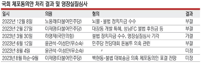 국회가 열린 뒤 구속영장이 청구되면 이 대표는 체포동의안 표결을 거치게 된다. 윤·이 의원이 비회기 중 구속영장이 청구돼 체포동의안 표결 없이 곧바로 영장실질심사를 받게 된 것과는 다른 상황이다. 민주당 내에선 갈등이 초래될 수 있다는 분석이 제기된다.