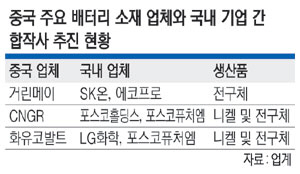 2일 관련 업계에 따르면 중국 거린메이(GEM)는 올해 3월 국내 업체인 SK온, 에코프로와 손잡고 총 1조1200억 원을 투자해 새만금에 연산 5만t 규모의 전구체 공장을 짓는다고 발표했다. 화유코발트와 CNGR도 LG화학, 포스코 등과 협력해 국내에 배터리 생산거점을 확보하겠다는 계획을 공개했다. 미국 블룸버그통신과 외신 보도 등을 보면 최근 4개월간 중국 배터리 관련 기업 5곳이 한국에 투자한 금액은 총 40억 달러(약 5조1000억 원)에 달한다.