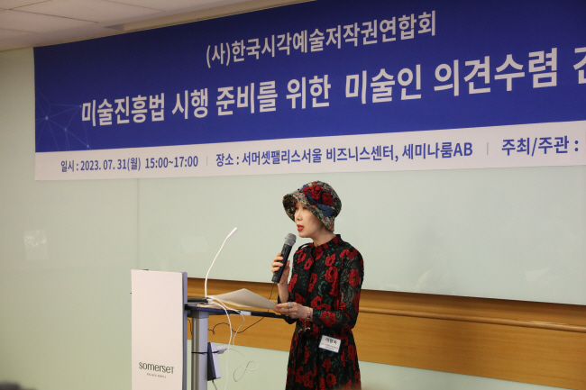 간담회에선 미술진흥법 쟁점 사안으로, 미술품 재판매 시 작가가 사후 보상적 성격의 청구권리를 가질 수 있도록 하는 내용의 추급권(재판매보상청구권) 도입을 위한 시행령 마련에 있어서도 정부가 미술인 입장을 적극 수렴해야 한다는 주장이 나왔다. 강 작가는 “미래 혜택을 볼 수 있는 젊은 작가들과 작가 유족들도 시행령 결정에 참여해야 한다”고 말했다. 이명옥(사진) 연합회 회장(사비나미술관장)은 “미술인 의견을 담아 미술진흥법의 효과적인 시행을 도모할 것”이라고 했다.