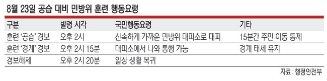 2017년 8월 이후 6년 만인 오는 23일 ‘공습 대비 민방위 훈련’이 전국 동시 실시된다. 행정안전부는 지난 5월 서울시의 경계경보 오발령 사건을 계기로 불거진 휴대전화 재난문자 발송 내용과 시스템 문제도 이 훈련 전후로 일부 수정 보완했다.